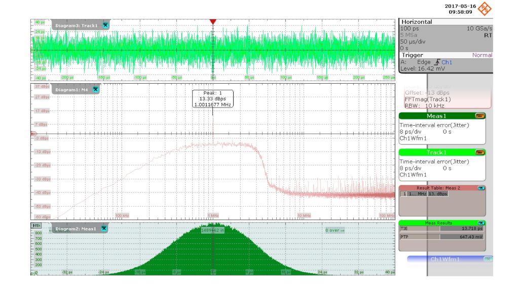 在下页中的图 1 顶部,R&S®RTO 测量波形显示为轨迹函数(TIE 伴随时间的变化趋势)。中间的图显示的是轨迹函数的 FFT。这个 FFT 显示为 PJ 的抖动频谱,代表的含义是信号的总体抖动 (TJ),单位为 dBps。底部显示测量到的 TIE 的柱状图。