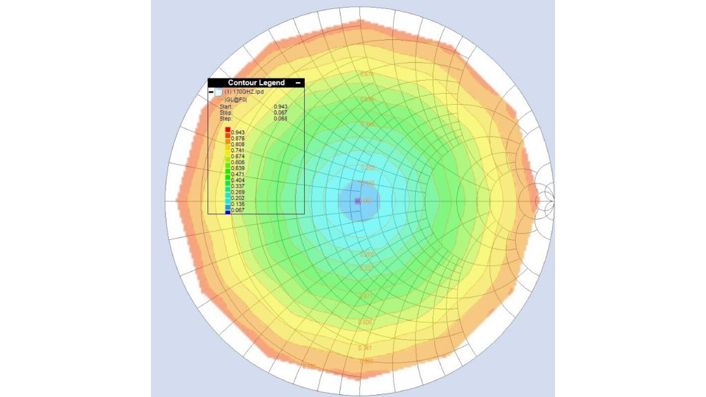 下图显示了 Focus D 频段 WR06 调谐器在 170 GHz 频率下在调谐器参考面上的阻抗调谐范围。图中显示,在调谐器平面上 VSWR 可轻松达到 16:1。调谐器在整个频段中保持非常平坦的 VSWR 响应。