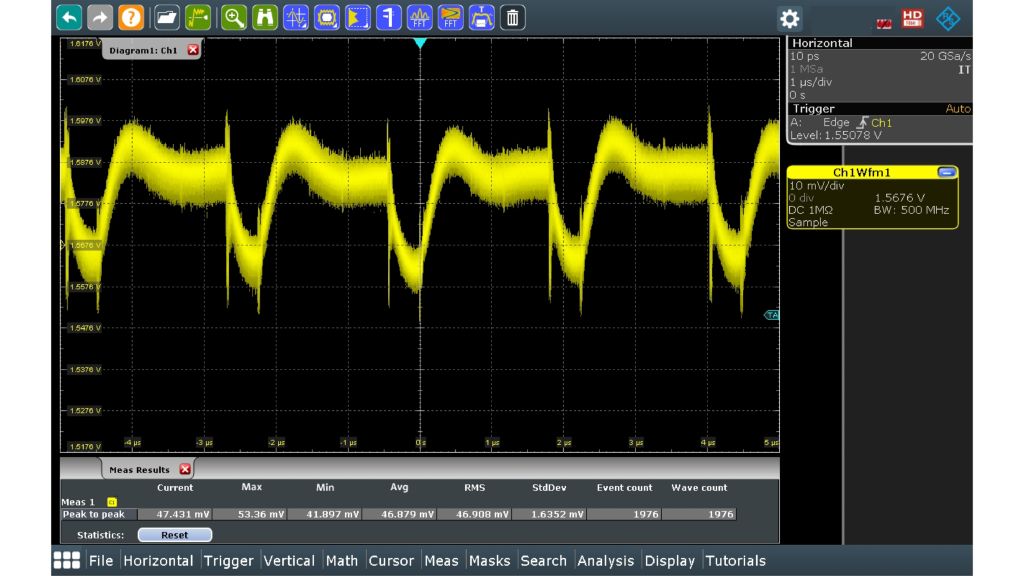 使用 R&S®RT-ZP10 10:1、500 MHz 无源探头测量 1.5 V 电源信号(50 mV (Vpp),噪声会掩盖信号细节)。