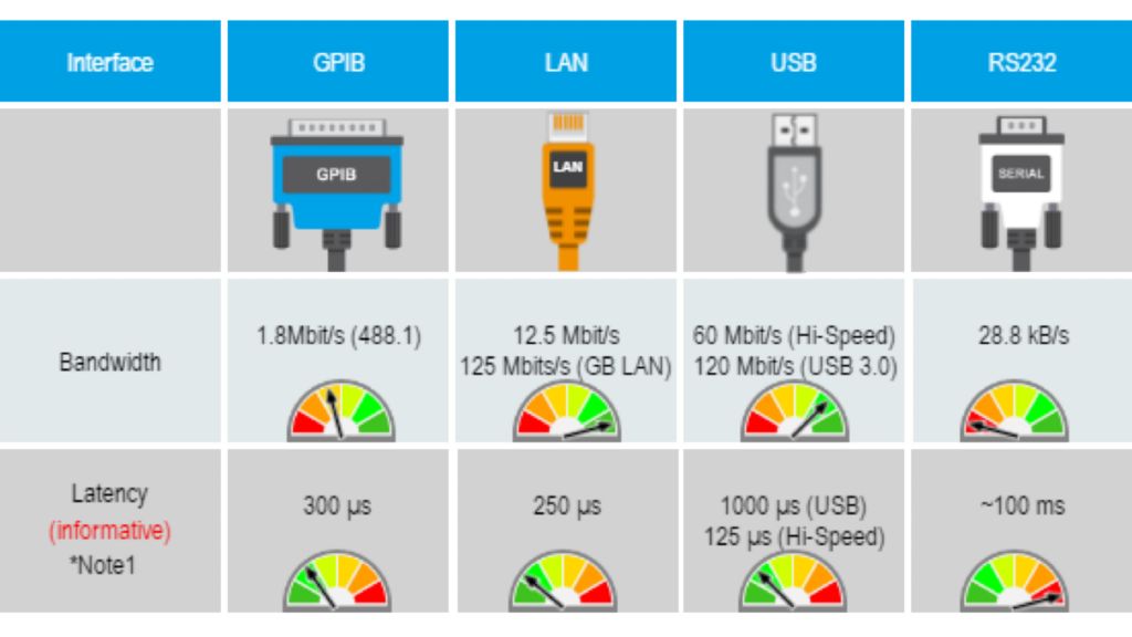 这个例子表明,运输少量水(即小批量数据)的时候,水管越短(即延迟低),速度越快。水管直径(即带宽)影响不大。但是,运输大量水(即大批量数据)的时候,即使水管较长(即延迟大),水管的直径越大(即带宽高),速度越快。现在来看看常见通信接口的延迟和带宽性能: