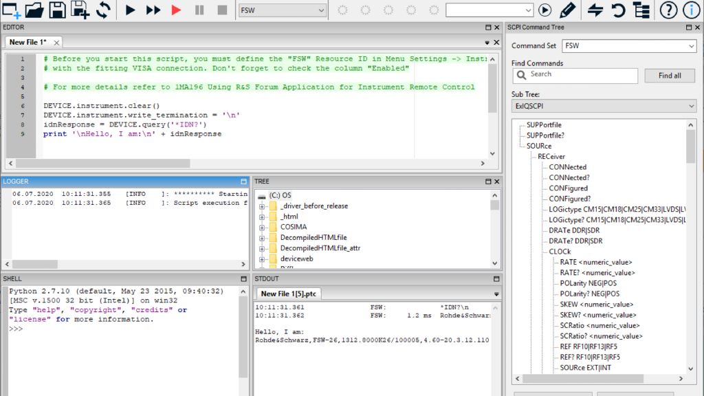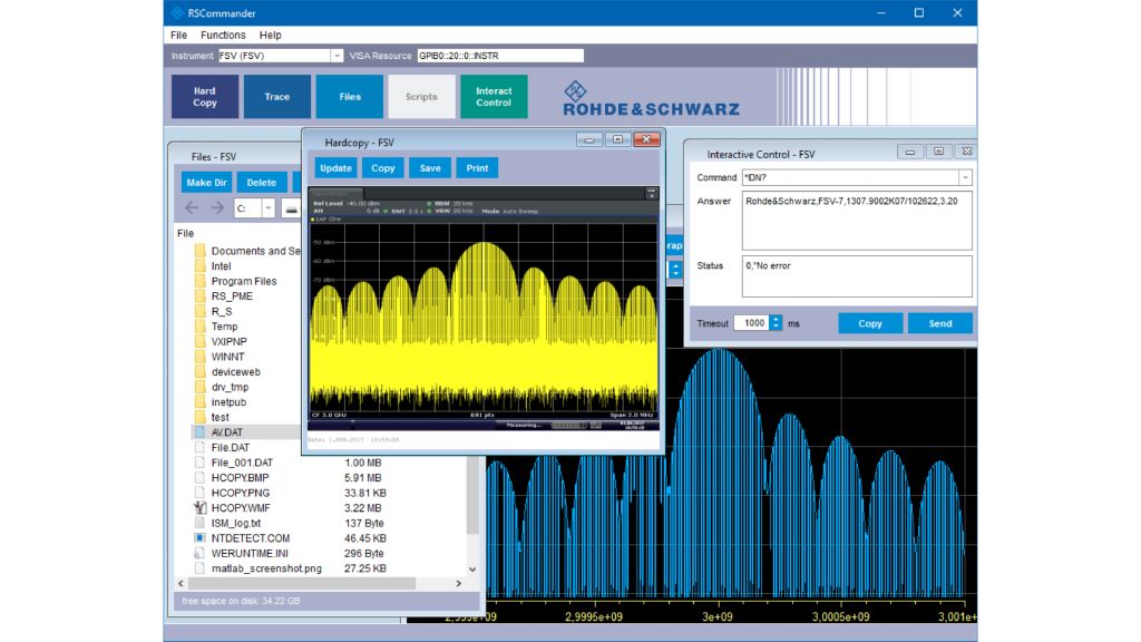 RSCommander 是罗德与施瓦茨开发的另一款远程操作工具,这个多平台应用程序提供交互式 SCPI 命令通信,支持在计算机和仪器之间交换文件,还提供检索跟踪和屏幕截图等多种功能: