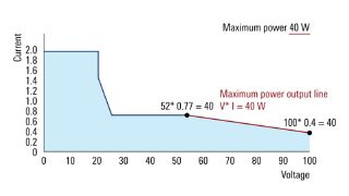 从数学角度而言,如果电压和电流均可相应变化,有多种组合可以产生相同的输出功率。例如,40 V 和 1 A、20 V 和 2 A 或 100 V 和 0.4 A 都可以产生 40 W 的功率。