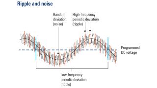 复杂的高级电子电路对电源线的电压变化非常敏感。为了尽量减少为被测设备 (DUT) 供电时的干扰,电源必须提供非常稳定的输出电压和电流。理想情况下,输出端应无电压变化。实际情况下,有两种变化会影响电路或设备:周期性变化(纹波)和随机变化(噪声),二者也被称为周期和随机偏差 (PaRD)。线性电源的高频纹波远小于开关电源。