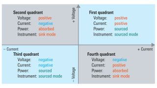 在第一象限和第三象限工作的电源通常还提供吸收功能以用于正负电压和电流。此类电源可在所有四个象限工作,并被称为源测量单元 (SMU)。在第一象限和第三象限中,电流从电压端子流出,电源处于供电模式。在第二象限和第四象限中,电流流入电压端子,电源在吸收电能。