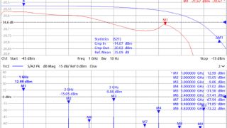 R&S®ZNA-K1 频谱分析仪选件:放大器增益和压缩测量,以及相应的 5 GHz 基础谐波含量。